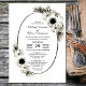 Um elegante convite de casamento floral preto e branco, rústico, com girassóis e margaridas, organizado em um quadro oval. Os detalhes de localização da cerimônia e recepção estão incluídos neste convite informando que seus convidados estarão presentes em dois locais separados durante a ocasião festiva. Uma solicitação de RSVP também foi incluída na parte inferior deste convite para lembrar seus convidados de confirmar sua presença em sua ocasião especial.