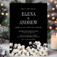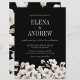 Este elegante convite de casamento floral preto e branco cai e flores de inverno. Fundo preto mostrado com texto branco e flores para casamentos brancas. O fundo de grandes florais brancos é opcional. Todo o texto, incluindo nomes, pode ser alterado.