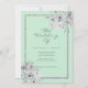 Um clássico convite de casamento tradicional branco com caligrafia manuscrita chic neo mint, flores pintadas à mão em aquarela branca e cinza com bordas elegantes de brilho prateado.