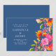 Este convite de casamento apresenta um rico fundo azul com flores vibrantes e pintadas em tons de rosa, laranja e coral. A arte botânica colorida combinada com tipografia refinada cria um visual romântico e sofisticado para uma celebração no jardim ou ao ar livre. Uma escolha linda para casais que amam papelaria de casamento ousada e artística. Disponível impresso ou como download digital instantâneo.