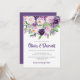 Buquês de flores de Watercolor em tons de roxo e lavanda com convites para casamento verdes. A parte de trás do cartão está roxa.