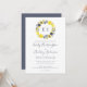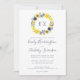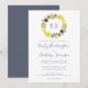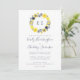 Esta design de casamento apresenta as iniciais da noiva e do monograma da noiva em cinzas moldadas por uma coroa aquosa de flores amarelas e cinzas. Personalize o texto com os nomes dos casais em uma escrita elegante e os detalhes do casamento em sans serif e itálico. O reverso é uma sombra sólida de cinzas.