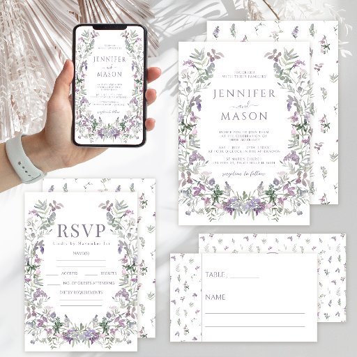 Mergulhe na sofisticação refinada com esta elegante rústica boêmica Ever depois do convite para o casamento da festa, apresentando ilustrações graciosas de flores de aquarela roxas formando uma coroa. Uma escolha perfeita para infundir charme em sua celebração de primavera ou verão, este convite captura a essência da beleza clássica.