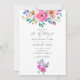Rosas com temas e peões ligeiramente cor-de-rosa-quente e convite de casamento floral com acentos de roxo, turquesa, azul e violeta.