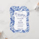 Um convite para o casamento que inclui um design floral azul e branco com elementos caligráficos
