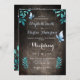O Design de casamento floral da borboleta azul-aquática russa apresenta um fundo de madeira, folhagem floral de cor aquosa e galhos em vários tons de verde e azul com borboletas cor-de-rosa.