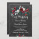 Buquê floral de rosas de burgundy vermelha e de peônias brancas com ramos de abeto verde-pinheiro e modelo de convite para o casamento foliar num fundo de quadros de carvão de cinza escuro com um texto moderno e moderno de roteiro. — O convite é ideal para o floral de inverno/casamentos de Natal.