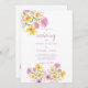Um fundo na moda branco de tendências com convites para casamentos florais cor-de-água rosa, amarelo e roxo pintados à mão.
