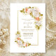 Um elegante convite de casamento cor-de-rosa com uma pincelada floral, com uma estrutura de ouro geométrica moderna e um florete branco, cor-de-rosa e macio. O texto é facilmente personalizável para você incluir seus próprios detalhes.