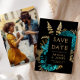 Este elegante e melancólico casamento "Salve o cartão da data" apresenta um buquê floral romântico e luxuoso em turquesa com folha de ouro e folhagem brilhante num fundo negro. Personalize o texto dourado em fontes na moda em um retângulo preto e adicione sua foto vertical favorita ao verso.