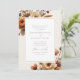 O convite apresenta um esquema sofisticado com um fundo de creme suave. Nas bordas superior e inferior, delicadas flores aquáticas em tons quentes de laranja, creme e castanho mudado enquadram o texto, adicionando um toque natural e orgânico ao design. O arranjo floral está disposto de forma artística para criar um aspecto equilibrado e harmonioso, melhorando a refinada estética do convite. A área central do texto é delimitada por uma estrutura fina e dourada, que dá à design um toque de luxo sem sobrecarregar a simplicidade da disposição geral. O texto é definido em uma fonte serif clássica, oferecendo um eterno e um apelo gracioso, perfeito para um evento formal. A combinação da delicada paleta de cores e da elegante tipografia faz desse convite uma escolha ideal para casamentos com um tema romântico, inspirado no outono. Essa design é perfeita para casais que buscam incorporar a beleza da temporada de outono à sua papelaria de casamento enquanto mantêm uma apresentação polida e sofisticada.