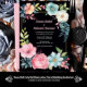 Convite de casamento de vintage floral com a design de flores embrulhadas em um quadro, com as cores rosa, azul, verde e preto. Muito bonito e fofo.