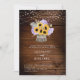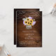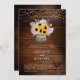 Um pote de flor, feito de latido de árvore e cheio de um buquê exuberante de girassóis, lavandas, trigo e hálito de bebê, assim como hydrangeas, faz uma bela ilustração, pintada à mão em aquarela digital, que decora este convite de casamento elegante e rústico que também apresenta um fundo de conselho de madeira e cordas de luzes. Romântico e charmoso, é uma escolha encantadora para um casamento de celeiro, um casamento ao ar livre, um casamento de jardim ou qualquer lugar rústico.