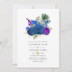 Marinho elegante e convite para casamento de rosas azuis reais com sotaques de púrpura em um tema de pavão barroco personalizável para seus eventos específicos.