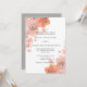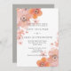 Um convite bonito e sofisticado para o casamento, com grandes buquês florais de aquarela em pêssego e pistas de blues, em fundo branco. O reverso está em cinzas de luz sólida.