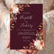 Este elegante convite de casamento moderno apresenta aquarela cai em forma floral e folhagem de outono em tons suaves de terra em dois cantos num fundo burgundy. O texto personalizável combina manuscrito branco e branco, fontes em copperplate e itálico. O lado inverso é sólido.