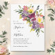 Estes convites para o casamento apresentam um design floral de aquarela moderno com flores e folhagem roxas, roxas e cor-de-rosa. Material de papelaria correspondente também disponível.