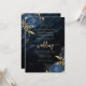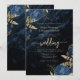 Este elegante convite para o casamento apresenta buquês florais azuis saltados com verde folha de ouro em dois cantos, em uma imagem de fundo de agate de cor azul marinho. O texto personalizável combina fontes de serifa, itálico e escrita manual douradas. O verso apresenta um marinho azul- e ouro floral e design agate correspondentes.