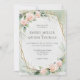 Convide convidados para a sua celebração com este elegante convite de casamento floral verde. Projetado com uma estrutura geométrica de ouro moderna, verde-aquarela macia e florais cor-de-rosa pincelados, é perfeito para temas de casamento românticos, jardins ou rústicos.