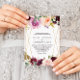 Este convite para o casamento floral com borboleta verde-dourada é perfeito para um casamento rústico. O design apresenta buquês de flores elegantes, verdes, esbranquiçados, roxos, vermelhos e burlões desenhados à mão, adorando quadros geométricos dourados, classe inspiradora e beleza.