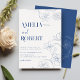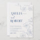 Um convite de casamento de arte floral e botânica, simples e moderna, em cores naturais neutras. Uma papelaria azul perfeita para casamentos.