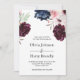 Personalize esses elegantes convites florais de casamento em tons de burgundy e blush com uma dica de azul marinho. As belas flores aquáticas parecem atordoantes num fundo branco clássico. A parte de trás da placa tem um design de cor d'água borrado.