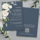 Com as populares características de convite para o casamento, tudo em um, e um esquema de cores da moda, este convite de casamento único apresenta um buquê cascata de florais brancos de aquarela com eucalipto à direita e verde num fundo azul marinho contrastante. As flores incluem rosas, híbridos e flores misturadas que combinam um efeito adorável. A parte de trás do convite tem um modelo de código QR para incluir seu site de casamento e outras informações para seus convidados. Eles podem RSVP diretamente ao seu site como uma conveniência adicional. Os emparelhamentos de texto usados neste design apresentam os nomes da noiva e do noivo de forma destacada usando uma fonte serif elegante em maiúsculas e em pares com outra fonte serif popular. Personalize o modelo de texto fácil de usar com seus detalhes de casamento.