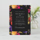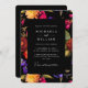 Este elegante convite de casamento apresenta um fundo negro impressionante com uma vibrante fronteira floral, criando um design dramático e romântico. As flores ricamente coloridas em tons de vermelho, laranja, rosa e roxo adicionam um toque luxuoso, fazer perfeito para o outono, inverno ou casamentos noturnos. Uma caixa de texto preto elegante no centro destaca os detalhes do casamento em tipografia branca sofisticada, combinando estilos clássicos e modernos. Totalmente personalizável, este convite dá o tom para uma celebração na moda e inesquecível, ideal para casais que amam estética ousada e elegante.
