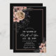 Um belo convite de casamento escuro com flores bege e cor-de-rosa tem samambaias, galhos, penas rasas e bagas em fundo negro. A tipografia gótica em apuros acrescenta à design. Personalize com seus detalhes de casamento. As pessoas adorarão seu convite exclusivo. Consulte coordenando itens em nosso compro, Finch Encantado ou entre em contato conosco para obter itens adicionais.