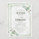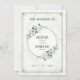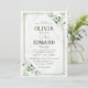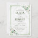 Convite para casamento A carta de convite para o casamento apresenta um quadro verde com um delicado buquê de flor em estilo aquarela. O fundo é uma sutil textura de mármore, adicionando um toque de elegância ao design geral.