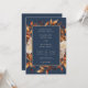 Convite Floral De Casamento De marinho Azul. Este elegante convite para o casamento contém lindas rosas pintadas à mão, cor d'água queimada, laranja e folhas de terracota, creme e beige, e belas ferrugem e marrom em fundo branco, perfeito para um casamento de outono! A parte de trás do convite tem um belo galho de folhas com a noiva e o monograma do noivo. Localize itens correspondentes na Coleção de Casamentos de Romance de outono Azul de Marinho.
