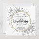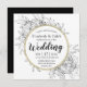 Este design apresenta peonias e folhagem num estilo de desenho de linha moderno e mínimo que lembra o formato floral. Os círculos Dourados destacam o texto correspondente que inclui sorifes clássicos e uma tipografia cursiva manuscrita. "Casamento" é mostrado no centro. O verso do chá de panela tem a "Recepção após a cerimônia". Há também muito espaço no verso para adicionar detalhes ou texto adicionais.