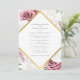 Este cartão de convite para o casamento apresenta um quadro geométrico impresso de efeito ouro com elementos florais em tons de rosa e branco. O layout do design é fácil de acompanhar enquanto preenche seus detalhes de cima para baixo clicando no botão "Personalizar". A tipografia é moderna em fundo branco.