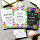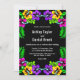 Este elegante convite de casamento tropical é perfeito para um casamento de verão moderno. O simples design apresenta flores amarelas, roxas e cor-de-rosa floridas com tipografia branca elegante sobre fundo preto em negrito.