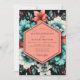 Este design apresenta uma arranjo botânico dramático e sombrio. Grandes flores pictóricas em tons de turquesa vibrante e coral suave sobressaem contra um fundo escuro e noturno. Flores delicadas em marfim e folhas verdes escuras adicionam profundidade e contraste a esta composição artística, criando um senso de elegância romântica.