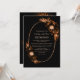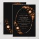 Um convite de recepção de casamento preto elegante com uma disposição floral rústica laranja queimada em uma moldura oval.