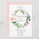 Convites florais elegantes com os seus nomes cercados por uma coroa de rosas de cor-de-água rosa e tulipas com folhas verdes e de cobre. Personalize os convites adicionando os detalhes do seu casamento abaixo. Os convites florais de casamento revertem para um fundo cor-de-rosa claro. Projetado para coordenar com a nossa coleção de casamento Blush Primavera Floral.