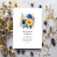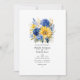 Convite de casamento real azul e ouro floral. O código QR no verso direciona para o seu local de casamento onde o pessoas pode aprender mais e rsvp.