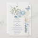 Romântica Dusty Blue Watercolor Convites de Casamento Floral apresenta celeste azul empoeirado e flores delfinium com eucalipto verde acentuado com borboletas. Adicione seu texto personalizado em um elegante script de caligrafia moderna. Projetado para você pelo Evco Studio www.zazzle.com/store/evcostudio