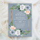 Convites para Casamento Floral Pink Pink Dourado Dusty Azul - design apresenta um fundo azul empoeirado com uma imagem de ouro impressa cortada em eucalipto e verde com elementos florais em cinza/branco, azul empoeirado e cor-de-rosa/pêssego. Exibir a coleção nesta página para localizar produtos correspondentes.