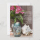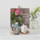 Um convite de casamento para praia rusticado com uma foto de um frasco de pedreiro azul de conchas, um vaso de flores tropicais cor-de-rosa, e uma grande concha sentada sobre uma superfície de burlap sobre um fundo de madeira rústica.