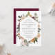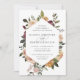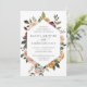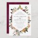 Um belo convite floral para o casamento em outono, com seus nomes em letras de escrita caligráfica, aninhado dentro a fronteira geométrica de flores de aquarelas e botânicos em tons de terra mutada de burgundy marsala, blush, marfim e sábio verde. Personalize com seus detalhes de casamento embaixo.