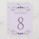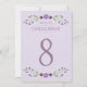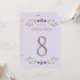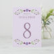 Cartões russos de números de mesas de casamento chic apresentam um quadro floral simétrico de lavanda, lilás, violeta e roxo de ameixa com folhas botânicas verdes com um olhar desenhado à mão que enquadra o design.