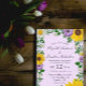Convite de casamento russo com girassóis vibrantes, margaridas brancas tradicionais e flores roxas coloridas contra fundo roxo leve com sopro de bebê e sotaques botânicos verdes
