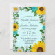 Convite de casamento russo com girassóis vibrantes, margaridas brancas tradicionais e flores de chá contra um fundo aqua leve com sopro de bebê e sotaques botânicos verdes