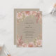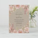 Este design apresenta um fundo bege quente adornado com rosas cor-de-rosa suave e peônias delicadas. O arranjo botânico inclui folhas de eucalipto e folhagens suaves, criando uma estética sofisticada. Perfeito para uma cerimônia romântica de outono ou primavera, a paleta combina neutros terrosos com acentos florais femininos.