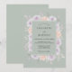Uma delicada composição floral em tons pastel suaves de lavanda e pêssego adorna um fundo verde sálvia suave. O estilo artístico de aquarela evoca um clima suave e romântico, perfeito para um evento elegante.