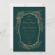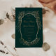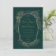 Linda estrutura de ouro com detalhes dourados correspondentes, em conjunto com fontes elegantes em um fundo verde profundo, criando um sofisticado convite para casamento, adequado para casamentos durante o ano inteiro. Veja na nossa loja mais itens correspondentes.