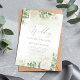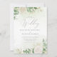 Um elegante convite para o casamento floral que inclui peônias brancas de aquarela e rosas com caligrafia manuscrita verde e moderna e delicada.