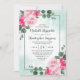 O design apresenta cor d'água, pedônia floral e elementos rosa em tons de rosa com eucalipto verde sobre uma falsa borda cintilante prata/cinza. Design também apresenta salpicos de aquarela em tons verdes claros ou de menta.